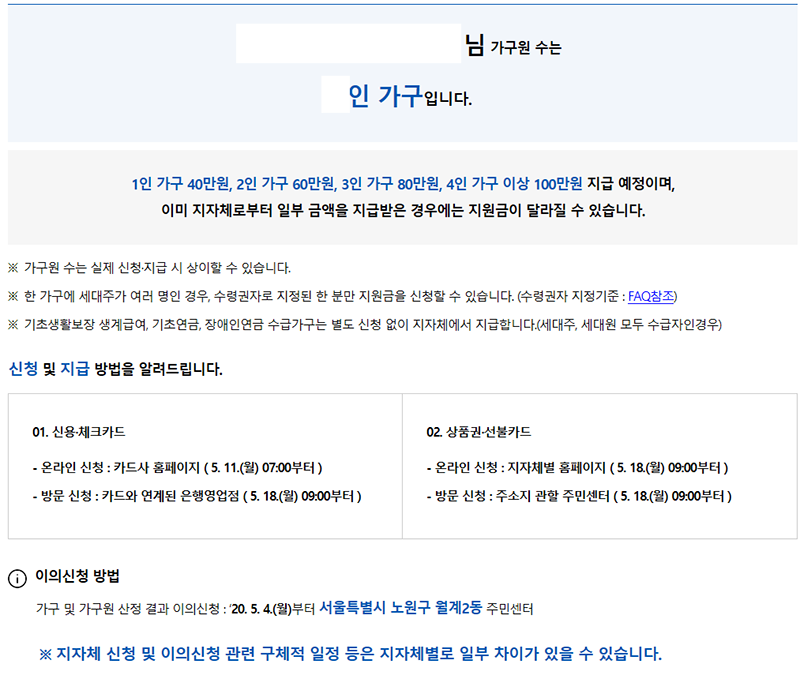 지급액 : 가구원수별 차등 지급 (주민등록세대기준 + 건강보험료상 가구기준)
