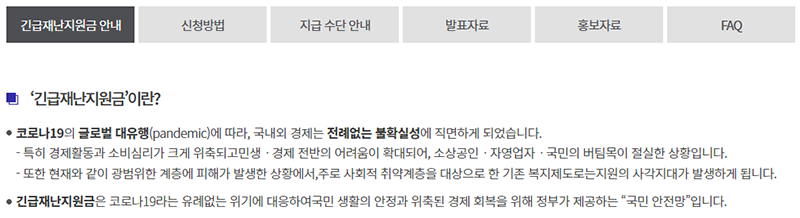 ‘긴급재난지원금’이란? 코로나19의 글로벌 대유행(pandemic)에 따라, 국내외 경제는 전례없는 불확실성에 직면하게 되었습니다. - 특히 경제활동과 소비심리가 크게 위축되고민생ㆍ경제 전반의 어려움이 확대되어, 소상공인ㆍ자영업자ㆍ국민의 버팀목이 절실한 상황입니다. - 또한 현재와 같이 광범위한 계층에 피해가 발생한 상황에서,주로 사회적 취약계층을 대상으로 한 기존 복지제도로는지원의 사각지대가 발생하게 됩니다. 긴급재난지원금은 코로나19라는 유례없는 위기