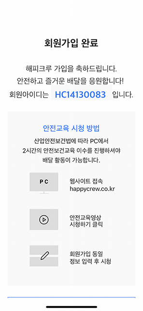 회원가입을 하였다면 PC에서 https://happycrew.wisehrd.com/ 로 이동하여 안전교육을 시청하여야 합니다.