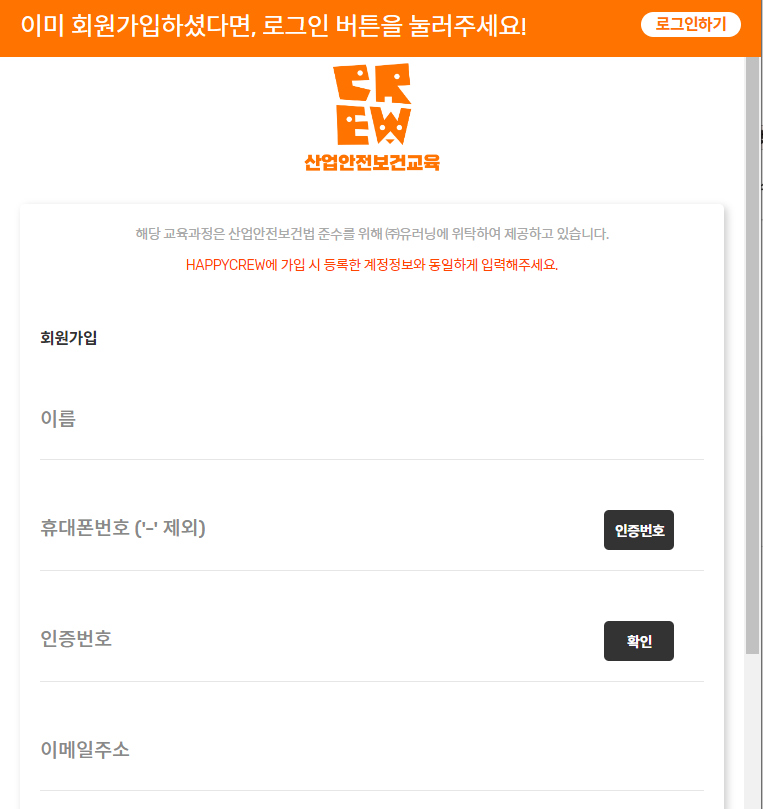 해피크루 가입시 이름 및 연락처와 산업안전교육 수료 정보는 반드시 일치하여야 합니다.