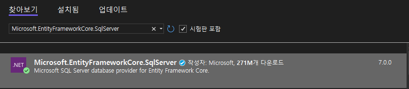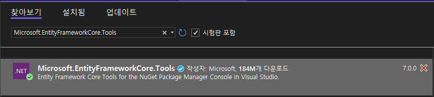 1. Microsoft.EntityFrameworkCore.Tools를 찾아 설치
