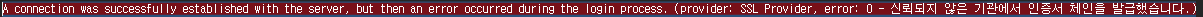 A connection was successfully established with the server, but then an error occurred during the login process. (provider: SSL Provider, error: 0 - 신뢰되지 않은 기관에서 인증서 체인을 발급했습니다.)