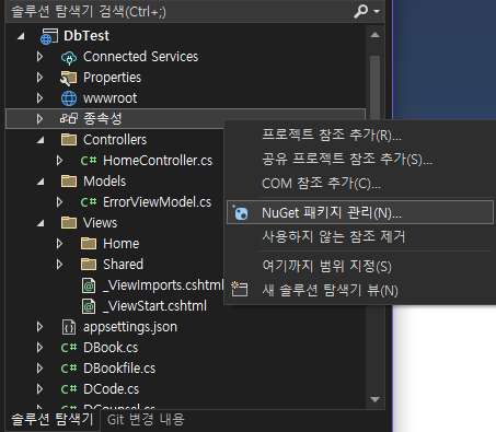 예전 오래된 Visual Studio와 달리 2022에선 종속성에서 마우스 우측을 눌러 NuGet 패키지 관리메뉴를 호출해야 한다.