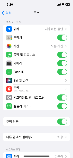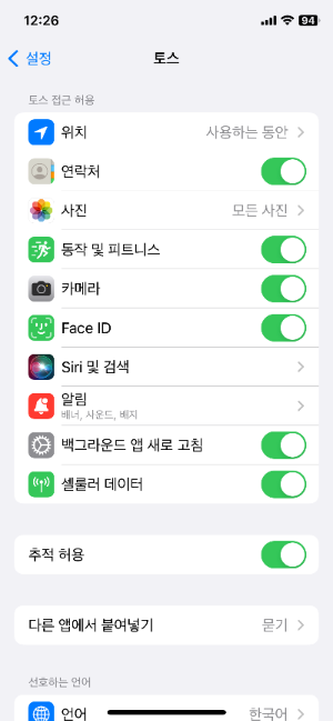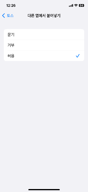 토스 설정으로 들어가면 다른 앱에서 붙여넣기가 기본 묻기 상태로 되어 있다.