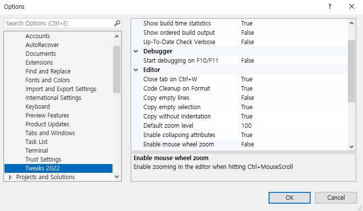 보다시피 mouse wheel zoom이 기본 False 로 셋팅되어 있다.