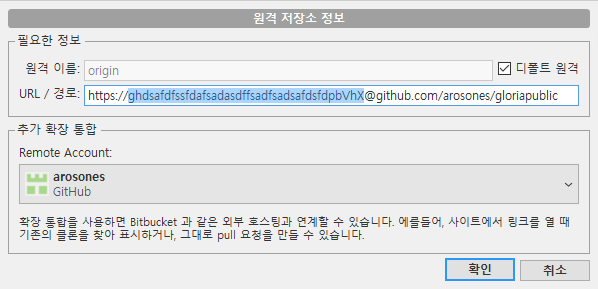 생성한 토큰은 Source Tree의 상단 메뉴의 우측을 보면 설정(톱니아이콘)이 있는데 여길 누르면 저장소 설정화면이 뜨고 원격 저장소 경로를 더블클릭하거나 편집을 누르면 아래와 같이 원격 저장소 정보 화면으로 이동된다.
