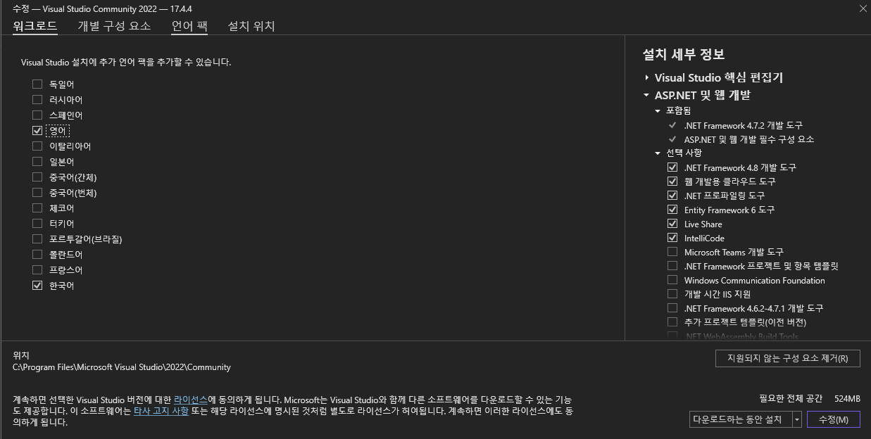 그리고 우측 하단의 수정버튼을 클릭하면 다운로드와 함께 언어패키지가 설치됨을 확인할 수 있다.