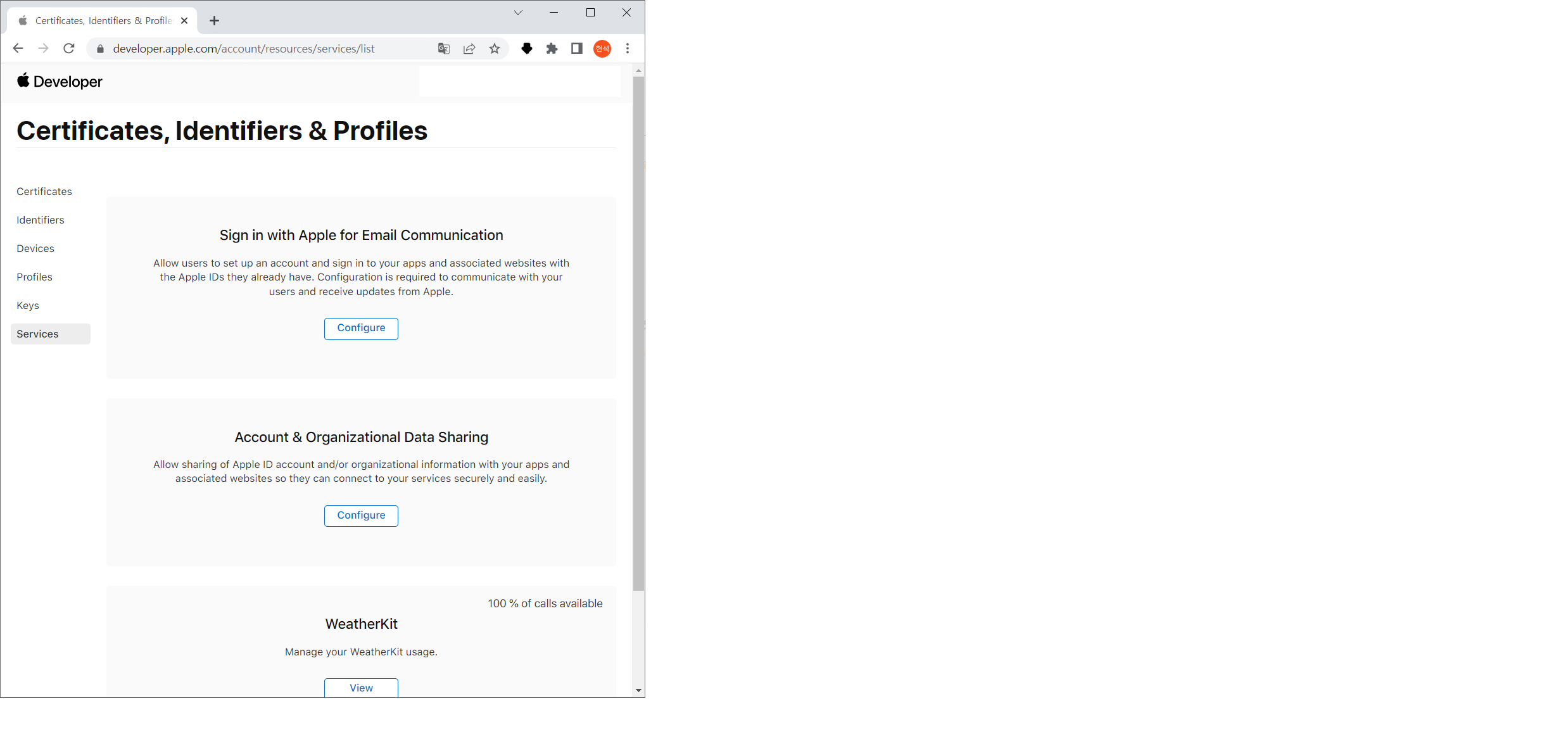 인증서, 식별자 및 프로파일 하단 메뉴들 중 아무메뉴나 선택 하면 좌측에 메뉴들 중 Services를 선택