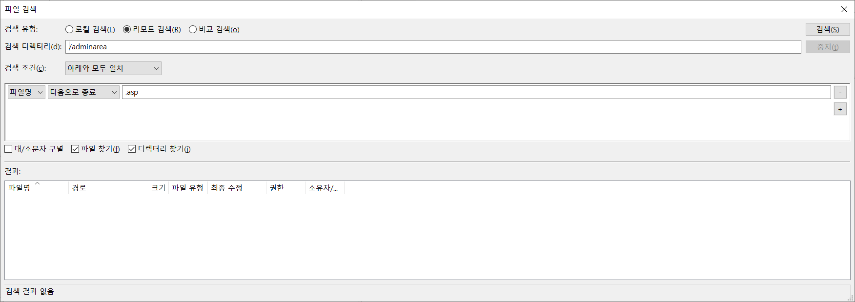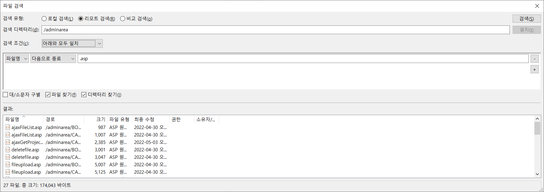 그리고 검색을 누르면 아래와 같이 현 상태의 디렉터리를 기준으로 그 하위 디렉터리에서 모든 ASP파일을 검색해 낸다.