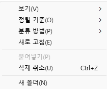 바로 마우스 우클릭 후 나타나는 팝업 컨텍스트 메뉴에서 새폴더 만들기나 바로가기 만들기 같은것들을 이용하려면