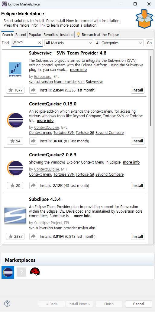 이클립스 마켓플레이스에서 svn을 검색하면 여러개가 나오는데 Subversive - SVN Team Provider 4.8 이거 설치하면 뭐된다.