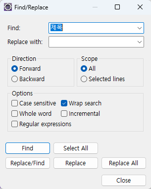 Wrap search를 체크하지 않을 경우 Forward인 경우 문서 끝까지 가버리면 더이상 찾질 못한다.