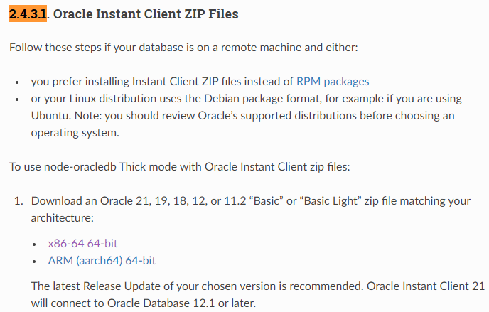 3.2.1을 보면 Node-oracledb Installation on Linux x86_64 with Instant Client ZIP files가 보일것이다.