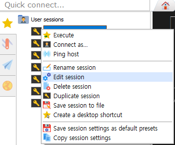 즐겨찾기 해놓은 sessions(서버)리스트에서 마우스 우측을 눌러 Edit session 메뉴를 호출하자