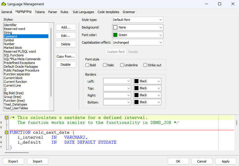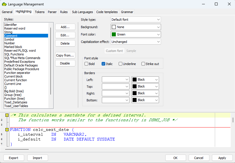 거기서 Highlighting탭을 눌러 Comment를 누르고 중앙에 Font style의 Italic에 체크를 풀어준다.