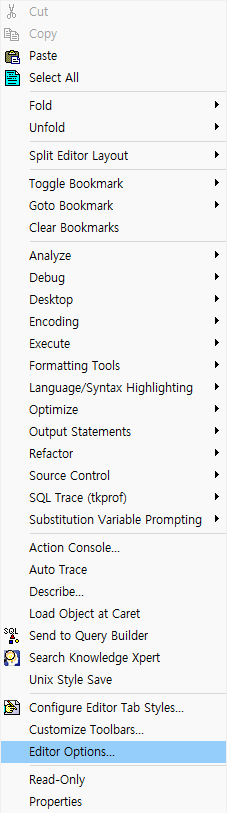 에디터에서 빈땅 클릭하고 마우스 우측 눌러 맨 아래쪽 보면 Editor Options... 메뉴를 눌러준다.