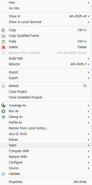 이클립스 프로젝트에서 마우스 우클릭 후 Team > Synchronize with Repository