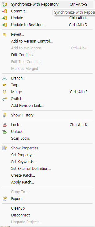 Commit : 서버로 내 로컬 소스를 올리는 작업으로 보통 작업 전에 Syncronize를 먼저해 본 후 본인이 작업하는 동안 다른 작업자가 작업을 해서 반영했는지 확인을 해야 충돌이 발생하지 않음