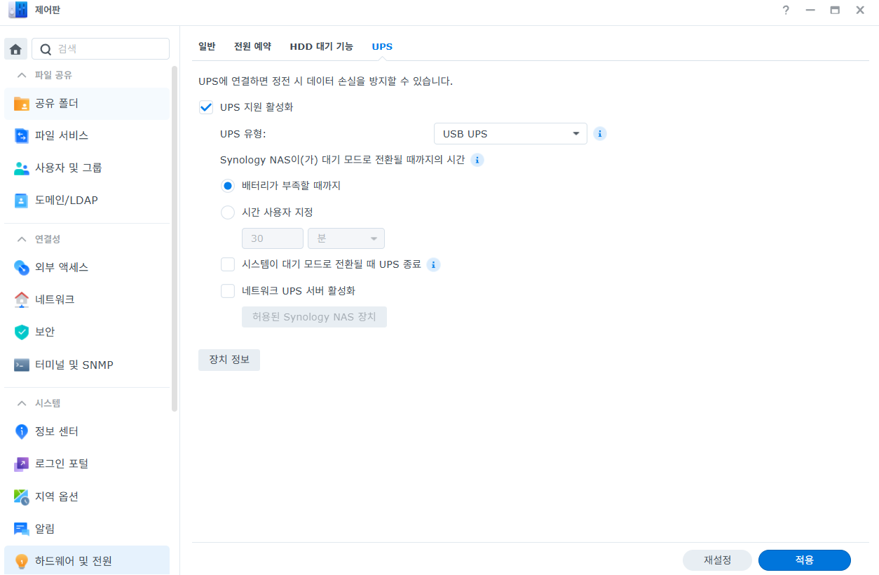 다음은 UPS를 어떻게 활용할지에 대한 설정이다. 시놀로지 NAS 장비 관리 웹페이지에서 제어판 > 하드웨어 및 전원으로 이동 후 상단 일반, 전원예약, HDD 대기기능, UPS가 보일것이다.
