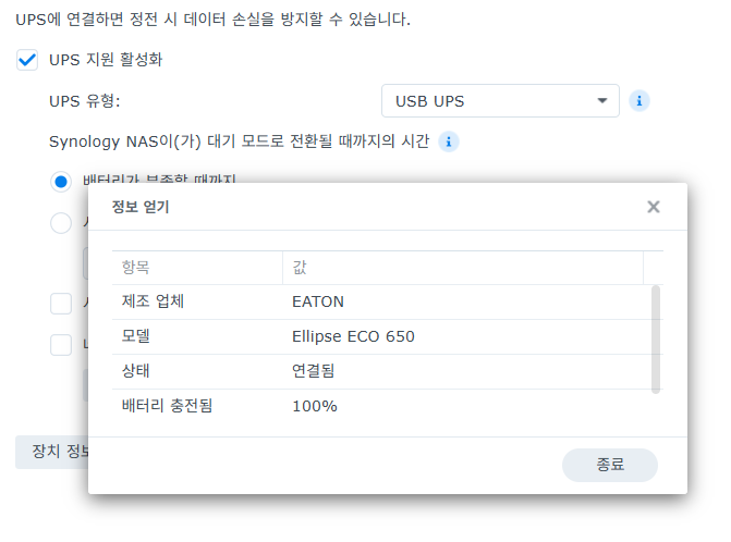 여기서 UPS 지원 활성화를 체크하고 나오는 옵션들 중에서 대충 선택해주면 된다. 난 그냥 배터리 부족할 때까지(사이고마데!)를 설정해주었다. 추가로 시스템이 대기 모드로 전환될 때 UPS 종료에도 체크를 해주었다.