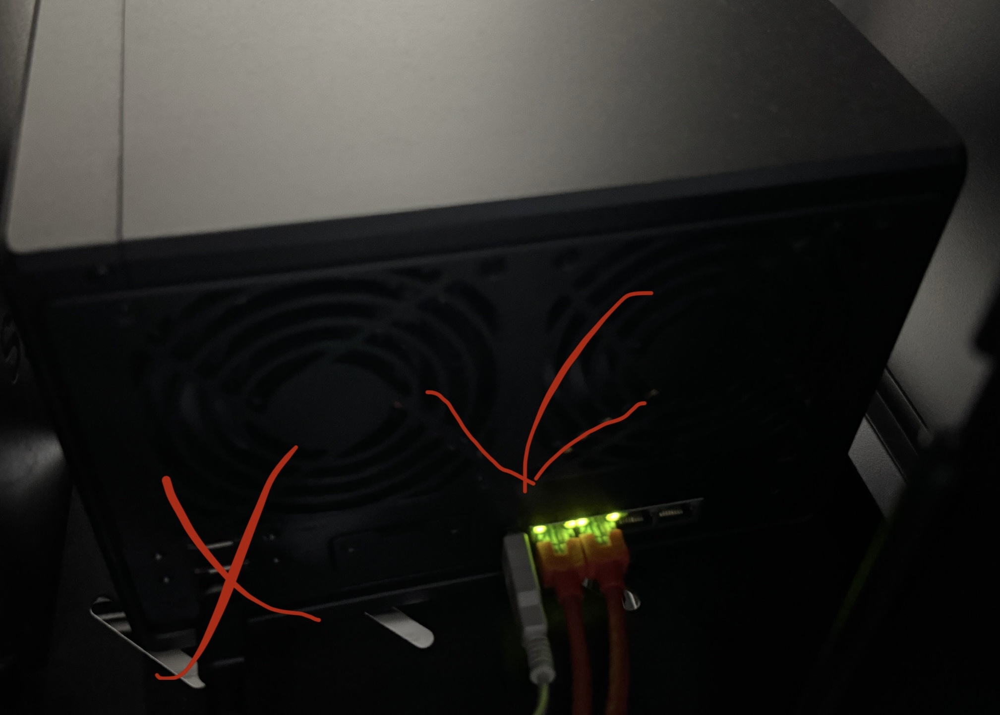 이것이 UPS의 USB 포트에서 NAS의 USB포트로 연결한 모습 좌측 x표시한 곳이 아닌 우측 화살표 부분이 USB 포트되겠다. NAS 앞쪽에도 USB 포트가 있던데 거기도 가능할 듯 싶다.