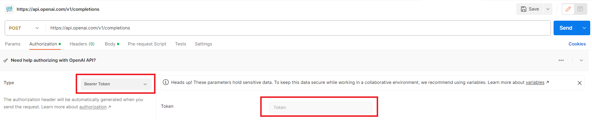 그리고 Type에서 BearerToken을 선택하고 Token에 아까 받아온 api key를 입력하면 된다.