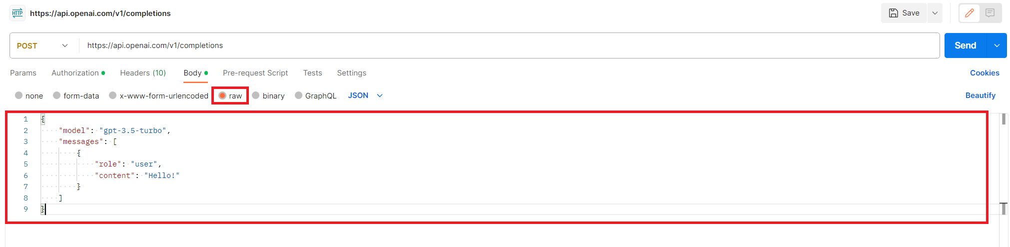 그다음으론 전송할 데이터를 입력해야 하는데 소스를 보면 json형식이니 모델과 메세지를 보내야 하는데 Body로 이동해 raw라디오 버튼을 선택하고 아래처럼 json을 입력하면 된다.