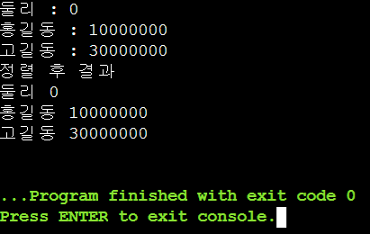 // 출력해보면 순서대로 홍길동 10000000, 고길동 30000000, 둘리 0이 찍히는것을 확인할 수 있다.