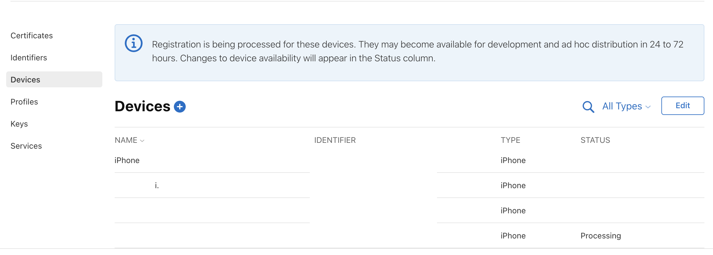 developer.apple.com의 devices list에 가봐도 다른 개발 아이폰들은 전부 STATUS가 정상이지만 특정 시점 이후의 아이폰들은 모두 Processing으로 떠있었다.