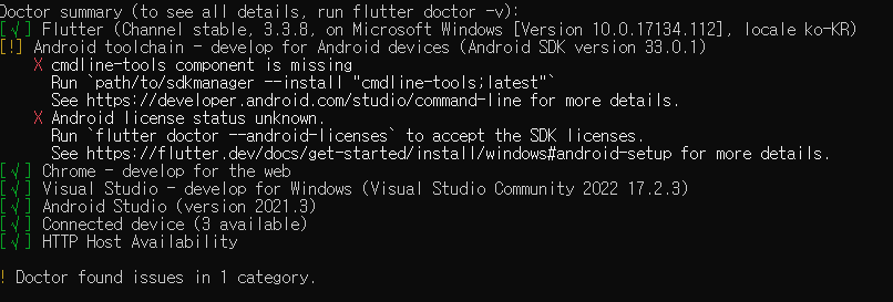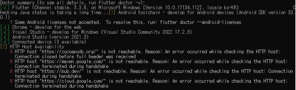 그리고 다시 cmd 상태에서 flutter doctor를 실행해보니 아 이건 또 뭐지 http host???